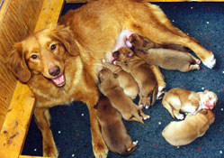For the four short years we had Inca, she was always a loving and sweet dog. Rather on the smaller side, she was nicely proportioned, very sound with good angulation, and a short strong back. We kept her from the one litter we had from Kestrel. She was struck down in her prime before she could complete her titles. She had a five point major at the Sunshine Classic going Best of Winners and Best of Opposite Sex. She had two legs on her NSDTRC (USA) CD, with both scores in the 190's. She was just about ready to run in HRC Seasoned. Don was doing all of her training then, and they had formed a very close bond. One morning safely in her kennel her disk ruptured so violently that it destroyed 10 inches of her spinal column. I came home as usual at 8 AM, she was a bit stiff, and so I made an appointment with my vet. By the time we got her there, and then on to the neurosurgeon she was completely paralyzed. After a milogram that showed the irreparable damage, we decided that we could not keep her alive, such an active and vibrant Toller, now resigned to dragging her lifeless rear around, with no bowel or bladder control, and no hope for it to get better. Thus we made the difficult decision to ask her to wait for us at the Rainbow Bridge. Don misses her to this day.