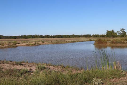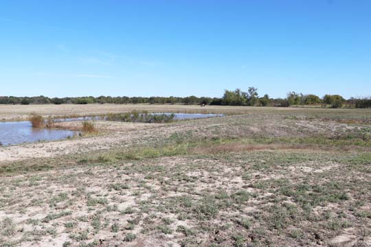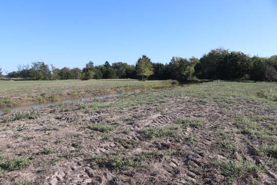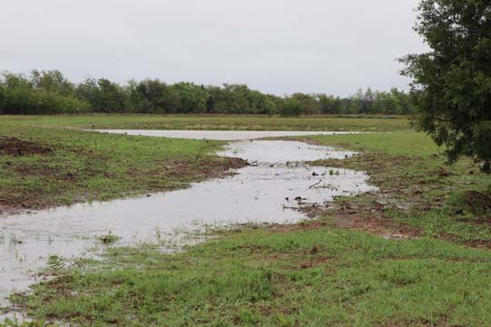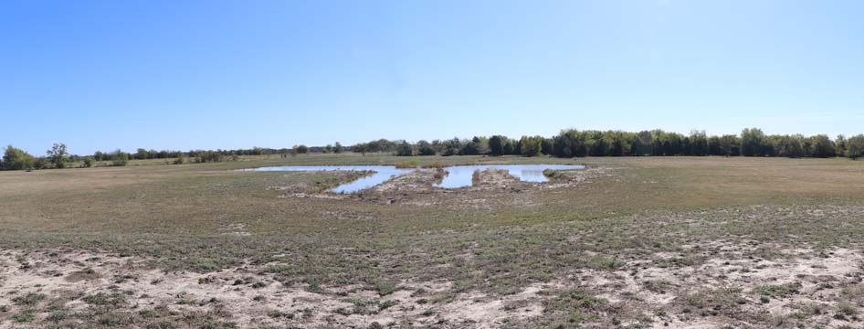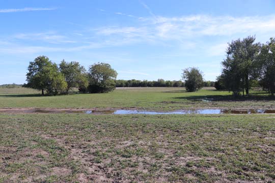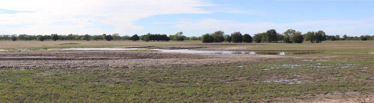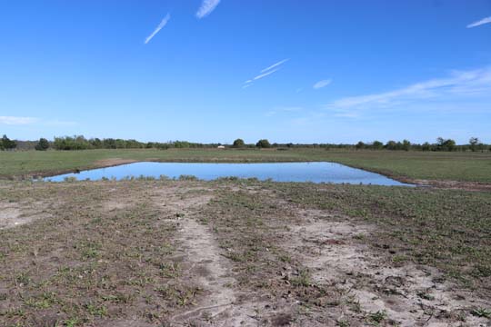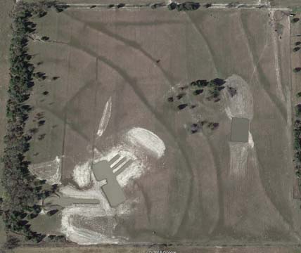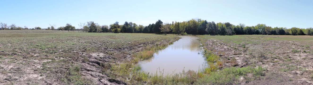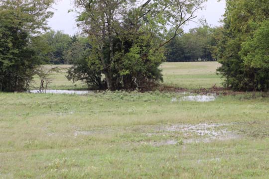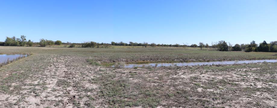 The Back 40 Training Area is actually about 40 acres! It includes a large land area with a complex technical pond system. The smaller pond called the Back 40 Pond, is the orginal pond. It was cleaned out and made substantially deeper, enlarged and then a long channel added. The dirt removed from digging the ponds was used to create hills on the relativly flat land. The hills give excellent vantage points to run long and or complex marks and blinds. There are also two small ditches that run East and West. You can see their outlines by the greener lines running to the Back 40 pond and into Technical Pond, and creates an outflow for the Technical Pond as well. Plans are to enlarge and deepen thease ditches. The curving outflow of the large technical pond that empties into the Back 40 Pond, also adds a lot to the complexity of the area. Cover varies from short and thick, to sparse to tall depending on the time of year, and when it was last cut. The pond is fed by run off and is almost Always full. The trees in the middle and South end add interest along with much needed shade. Seasonal flooding makes a UTV or ATV necessary in the wetter months, but also interesting for the dogs to run through the flooded areas.