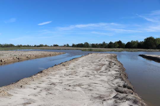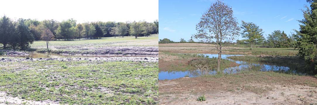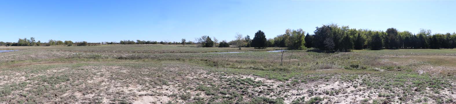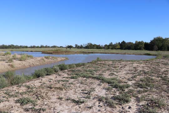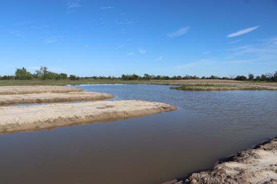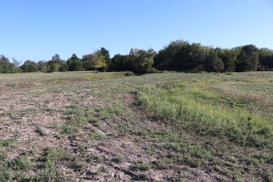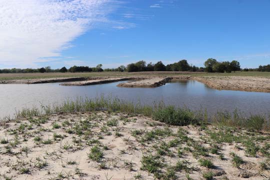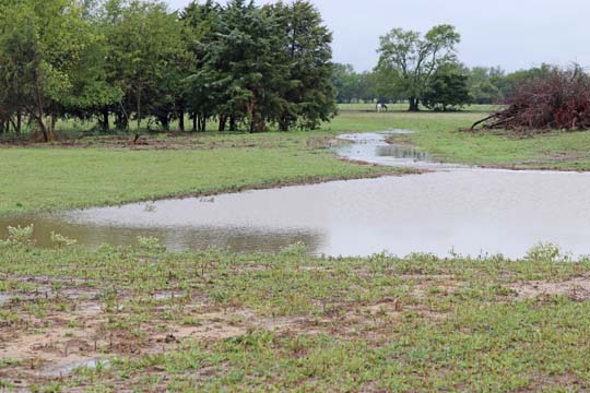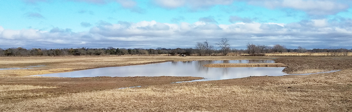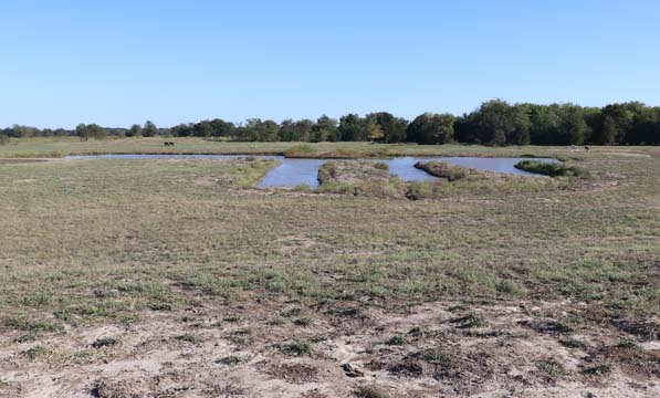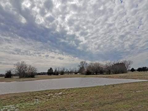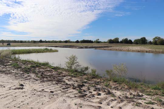 The Back 40 Training Area is actually about 40 acres! It includes a large land area with a complex technical pond system. The smaller pond called the Back 40 Pond, is the orginal pond. It was cleaned out and made substantially deeper, enlarged and then a long channel added. The dirt removed from digging the ponds was used to create hills on the relativly flat land. The hills give excellent vantage points to run long and or complex marks and blinds. There are also two small ditches that run East and West. You can see their outlines by the greener lines running to the Back 40 pond and into Technical Pond, and creates an outflow for the Technical Pond as well. Plans are to enlarge and deepen thease ditches. The curving outflow of the large technical pond that empties into the Back 40 Pond, also adds a lot to the complexity of the area. Cover varies from short and thick, to sparse to tall depending on the time of year, and when it was last cut. The pond is fed by run off and is almost Always full. The trees in the middle and South end add interest along with much needed shade. Seasonal flooding makes a UTV or ATV necessary in the wetter months, but also interesting for the dogs to run through the flooded areas.