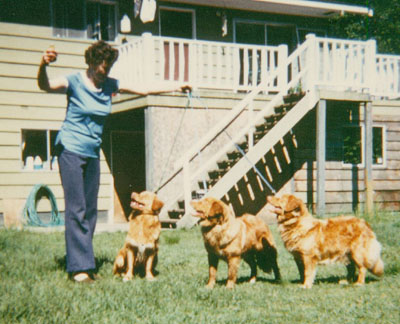 It was in Northern California in 1977 getting a relay race (scent hurdle) team together where I saw a movie (YES an 8mm movie!) of a rare breed called the Nova Scotia Duck Tolling Retriever racing in Regina Saskatchewan Canada. I was immediately taken by the breed. I was going to some shows and obedience trials in British Columbia that summer and made a point to see the Tollers. I visited the Aitken's Coltriev Kennels and Alison Strang's Westerlea Kennels. Months later, my puppy Eric (CAN CH WESTERLEA'S CINNSTAR ERIC) was flown to me from Alison from her second litter of Shelly (CAN CH SHELBURNE OF JEFFERY COLDWELL) and a stud in Nova Scotia: Biggs (CAN CH CRUSADER OF JEFFERY COLDWELL CAN CD). This was the same litter that Alison's famous Toller Tip (CAN BIS, BISS CH WESTERLEA'S WHITE ENSIGN) came from. Sadly, Eric at just a little over two years old suddenly died of an inhaled foxtail that had set up a massive infection in his lungs. My next Toller Teal (CAN/MEX CH WESTERLEA'S CINNAMON TEAL CAN/MEX CD, GRCA WC) also from Alison Strang came soon afterward to replace Eric. Teal was my foundation bitch, and all Cinnstar Toller's can be traced back to her.