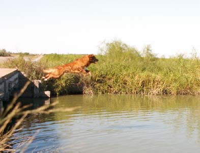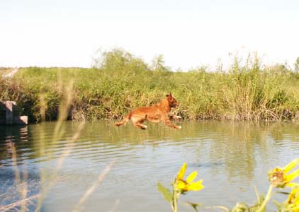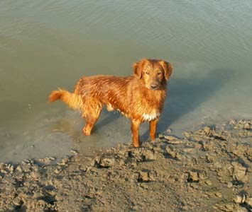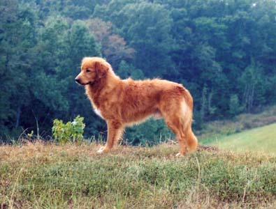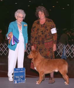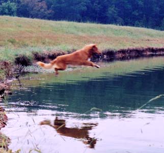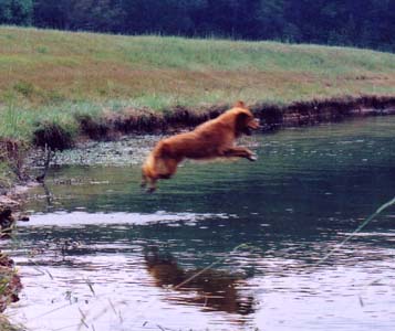 Flare was a team player from the word go. He had a sweetness and gentleness that is not found in some of my other males and thus is a bit more sensitive. Sometimes team players do not think for themselves. NOT Flare. He is as high rolling as any Cinnstar Toller. And he can go the distance required of an all age dog, showing independence when needed to find his marks. He is naturally honest on water. He is a bit taller than Flash, and has nice bone and structure. His front movement is exceptional, both front and side view. Flare finished his AKC CH from the Bred By Class, including a 4 point major, and 5 Best of Breed wins.