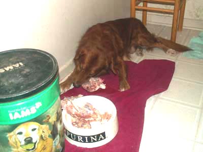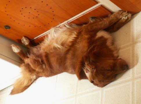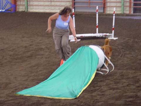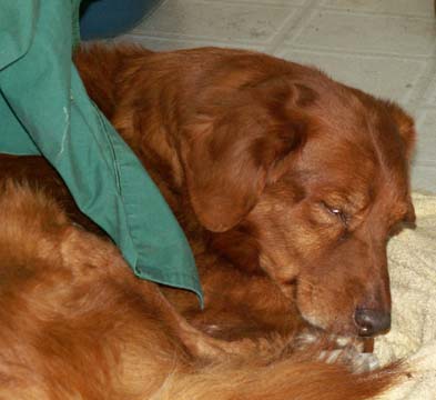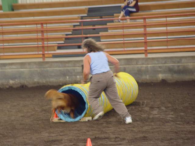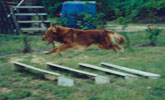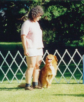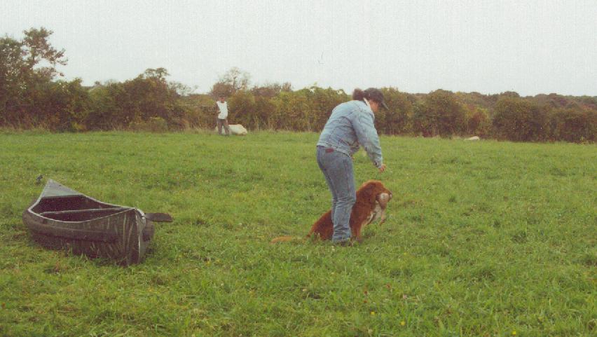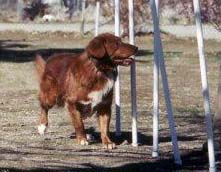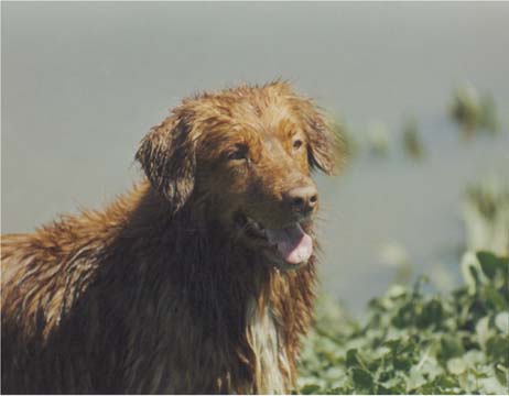 Tattooed with a flaming red, orange and yellow lightening bolt on his flank, The Flash is an Ian/Fox son from their second litter. I was determined not to make the same mistakes with Flash I did with Ian. Flash accordingly lived his life at 150% overdrive. Ian was an excellently trained, highly precise, but methodical worker. While The Flash was capable of precision with an AKC All breed Obedience High in Trial (The First Toller to Win an a High In Trial) from the Novice B class (First AKC Obedince Title), and two second places in Open A, he was more well known for his sliding stops into the ring gating while retrieving his dumbbell. He would stop on a dime on a 300 yard blind, but felt the heel to the line is more of a race to the mat (In All Age Retriever Stakes, the retrievers are run off a piece of carpet), and I am left behind. In short he was a true, wide open, All Age Retriever. He is typical that he could not believe that a mark could be only 50 yards away. Like my Canadian Field Trial CH Black Lab Buddy, Flash could come close to catching the bird if he broke on a very short mark. Flash has one First Place, and several other Open All Age picnic trial placements, but due to his PRA we had to retire him before he could compete in any AKC Field venue. But Flash was not a retriever that you could keep down, and started a new venue: Agility. Flash participated until his vision became so impaired that he was retired from all venues in 2005.