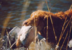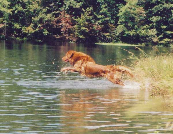 For all of his high drive, Flash was a congenial dog. He never met a person or animal that he did not want to call friend. There are some Toller people that feel that to perform at the highest level of Hunt Tests/Field Trials that the Toller has to have an edge or sharpness to its temperament. I totally disagree. You will not find a more aggressive retriever of any breed in the field then The Flash, and a totally non-aggressive dog toward other dogs, people or any other animal. The Flash was the kind of Toller that loves his toys, never tearing them up. He also liked to arrange them around our house in specific places. In South Carolina for a time Flash lived in the kennel with the force table in it next to the duck pen. He would sunbathe on the force table with one of his favorite plush toys; a lavender and pink full sized duck. The live ducks right next to him he totally ignored. So much for bad memories of the force fetch table and saying a dog is birdy getting excited over every bird they see. Flash knew when it was time to perform.