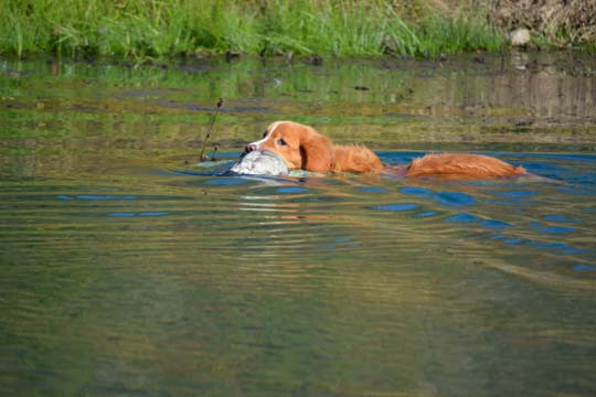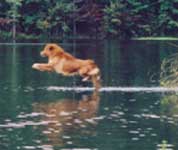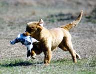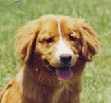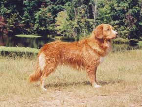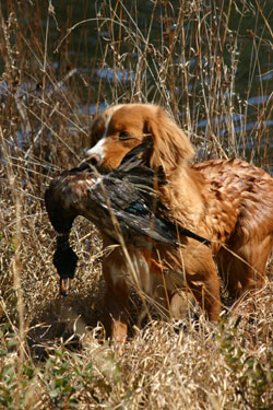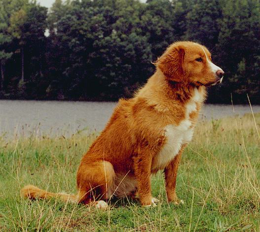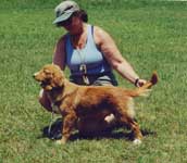 As an 8 week old pup Surfer showed tremendous promise in the field. When taken to the line she would start looking for the guns, and when she saw them would sit (on her own) with her attention riveted. She was never wild or crazy, but quietly intense. She is the best natural marker I have had in Tollers. Most Tollers tend to be "area" markers; they get to the area, and start to hunt, as opposed to a pin point marker who runs directly to the bird without a hunt. Most female Tollers I have found mentally mature at a slower rate, and lack the early concentration. Early concentration is not just required in a competition dog. It allows the hunter (or any performance venue) to start serious work at a younger age. You do not want to have to wait until the retriever is two or three years old. Trainability at an early age is something I have been working on in my breeding program, so I was especially pleased that Surfer showed this kind of promise. Another aspect that I have found in Surfer is her tendency to run in a straight line. Even on flat even ground, most Tollers tend to "banana". I attribute this to the herding dog in them, and not my training as the Labs and Golden have run straight lines. Surfer, even thru cover or terrain attempts naturally to run straight. These abilities she has passed on to Flare, her son, and other puppies in her first litter.
