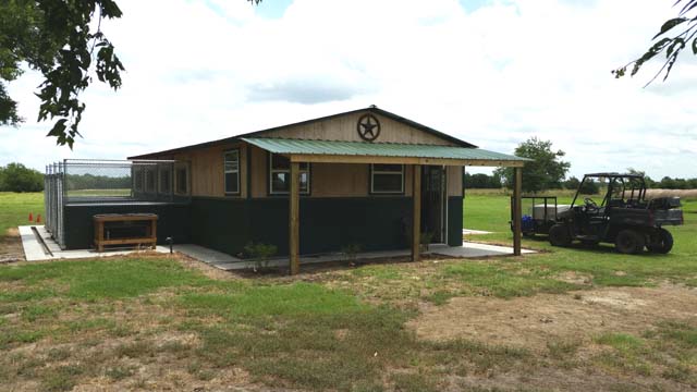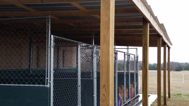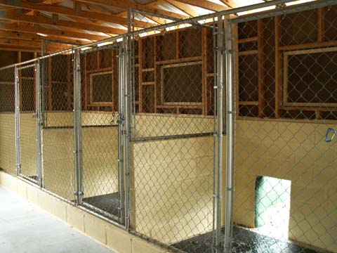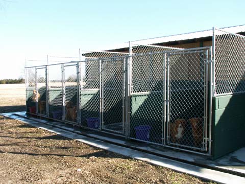 Our New Kennel Facilities Our new kennel facilities are designed and being built with your retrievers comfort and health in mind. We are a small training facility and have 8 large indoor/outdoor fully lighted runs. The floors are Concrete with four foot block walls separating each retriever from its neighbor, and heavy gauge chain link. 7 x 5 inside, and 7 x 10 outside. The inside has heavy rubber horse matting and carpet or blankets for retriever comfort except in winter when we use cedar and pine flakes on top of the rubber horse matting for added warmth. In the summer fans keep air circulating and the plug windows over each kennel are open. Outside runs are completely covered.